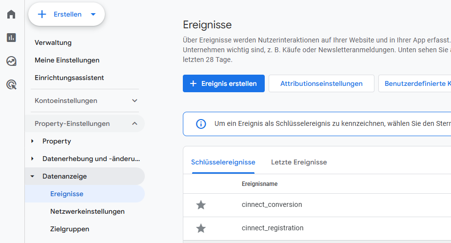 In diesem Beispiel haben wir cinnect_conversion & cinnect_registration als Schlüsselereignisse markiert (empfohlen). Schlüsselereignisse können in Google Ads als Metrik für eine erfolgreiche Anzeigenkampagne genutzt werden. Sie können Ihren Website Traffic auf Conversions optimieren, also geziehlt Personen auf Ihre Website lotsen, die Google mit hoher Wahrscheinlichkeit für potenzielle Kunden hält.
